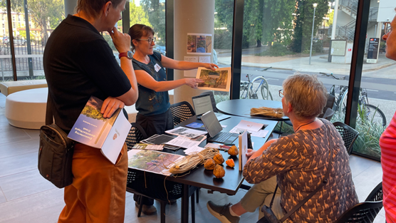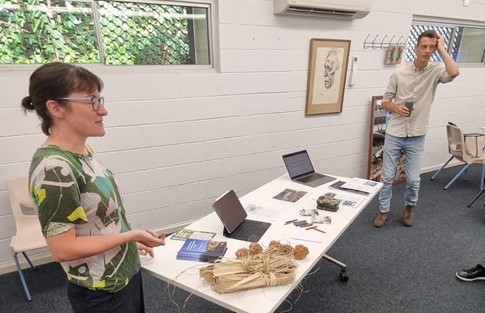 Through the good graces and canny grant writing of TopEndSTSer Kirsty Wissing, we were fortunate to host a preparation event in the lead up to the Making and Doing session at AusSTS 2025. The setting was the Northern Australia Research Unit (NARU) an outpost of ANU, where we were able to spend a full day trying out our M&D presentations. The format was unfamiliar for most, and the presentations that we were trying out took different forms. Sam played some of the video footage he had gathered when working at the behest of traditional owners as they evidenced their connection to sacred sites. Each clip showing different stages of editing and differing enactments of places and authority. Christine had images of the Chinese artefact that had been found in the roots of a Banyan tree, and worked through archive and story to reveal its contested providence. And I had my first run through of the way in which our participative involvements with Gurambai/Rapid Creek might appear in a university setting. The crowd was a friendly one, and I knew there was a certain sound, feel and tonality that I wanted to be present. It was the muted tones and colours of the sands at the saltwater end of the creek, mixed with and carried through some of the vibrant oranges and greens of the pandanus nuts and fronds from the upper reaches of the creek. I had gathered together different objects and materials, some gathered along the creek, some produced in our previous writing up of TopEndSTS forays. I felt there needed to be a mix of materialities of the creek (such as pandanus nuts) as well as images, sounds and texts (in the form of maps, zines, historical stories all created by TopEndSTSers) all appearing their together side by side, but without one particular form dominating. So that those meeting the display could also sense the crunch of footfall and the flow of the water, I played on a loop a soundtrack of a past creek walk and added a rolling set of slides showing us in strange positions, holding sound recorders up to listen to the sounds of swamps, or flows of water over weirs. In the middle I placed a small screen with the footage of swimming fish on it, and invited people to try the inefficient mapping. Here, while the creek seemed to seep through my conversation as I narrated the various things on the table as practices, or doings, of the creek, this interactive element with the fish didn’t really take off. But I liked it, and decided to keep it in the show (so to speak) when I went to Canberra.
